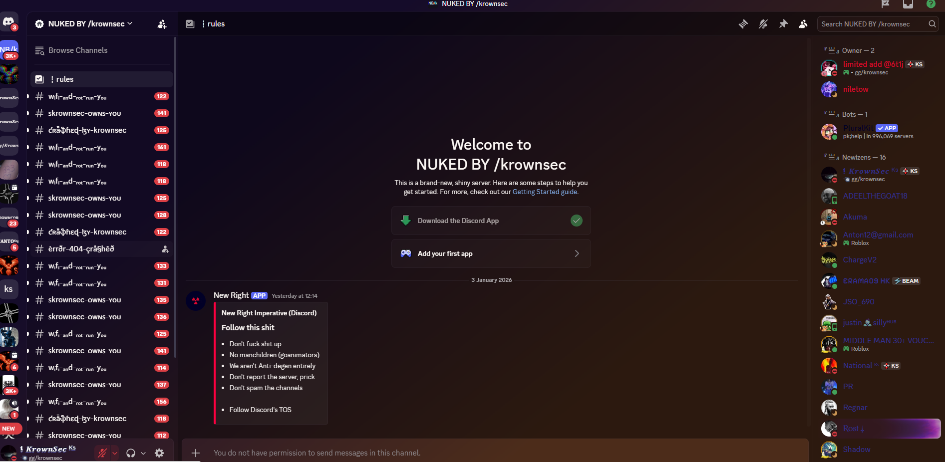 Our purpose is to destroy and own many discord servers and making them joining us, just for fun and pure destructions...